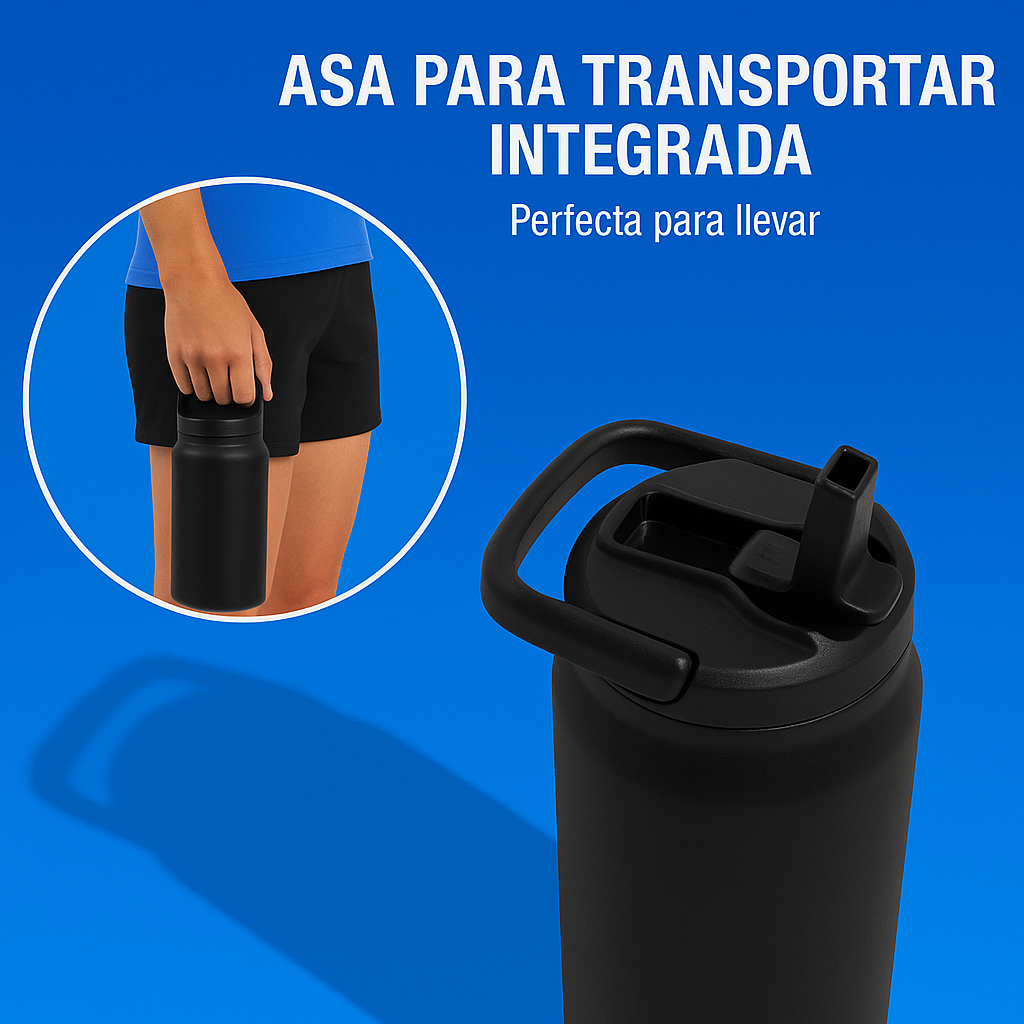 Perfecta para viajar y entrenar: el asa de transporte integrada facilita llevar la botella a todas partes y engancharla al bolso de gimnasio o a la mochila, manteniendo la hidratación siempre a mano.
